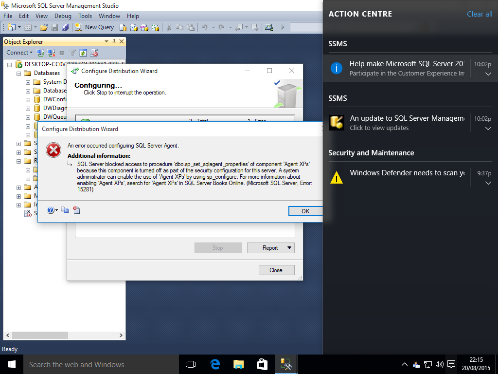 A fresh install of SQL Server 2016 CTP 2.2 (re-released version) errors when creating the distributor on the final step to start SQL Server Agent with