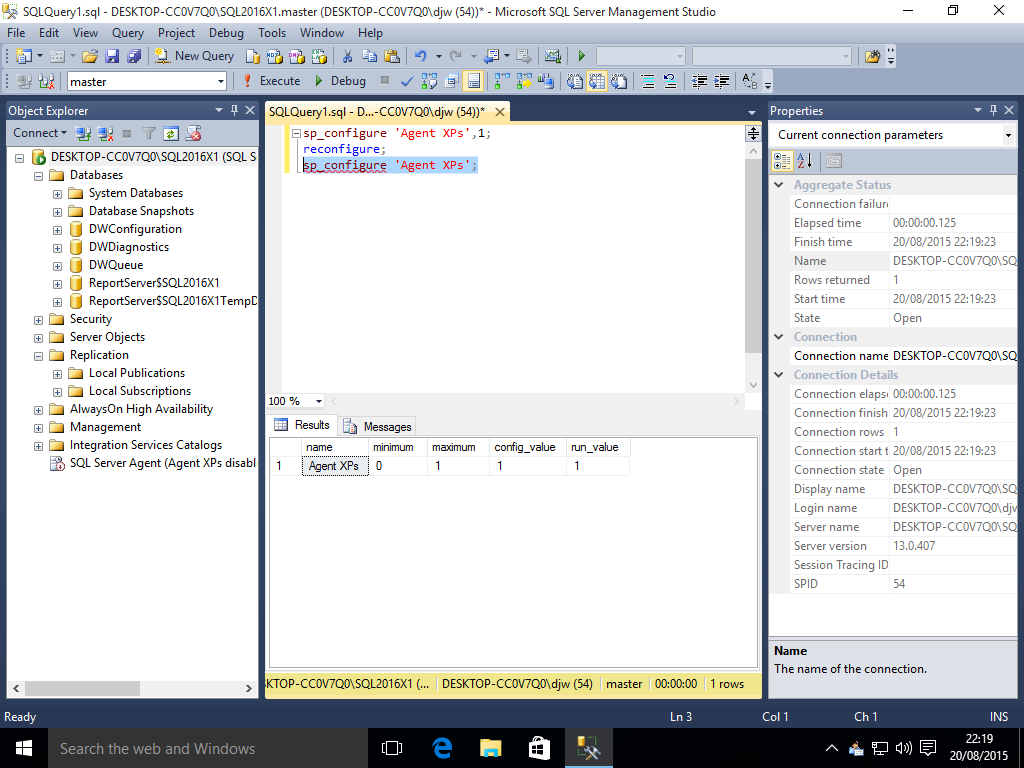 Microsoft SQL Server 2016 (CTP2.2) – 13.0.407.1 (X64) Jul 22 2015 21:19:11 Copyright (c) Microsoft Corporation Enterprise Evaluation Edition (64-bit) on Windows 10 Pro Insider Preview 6.3(Build 10162: ) (Hypervisor)