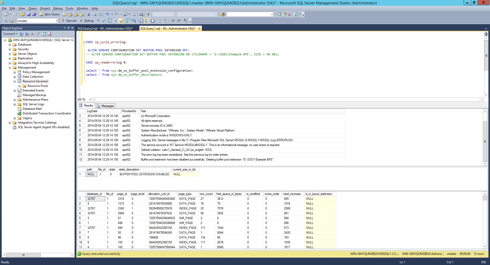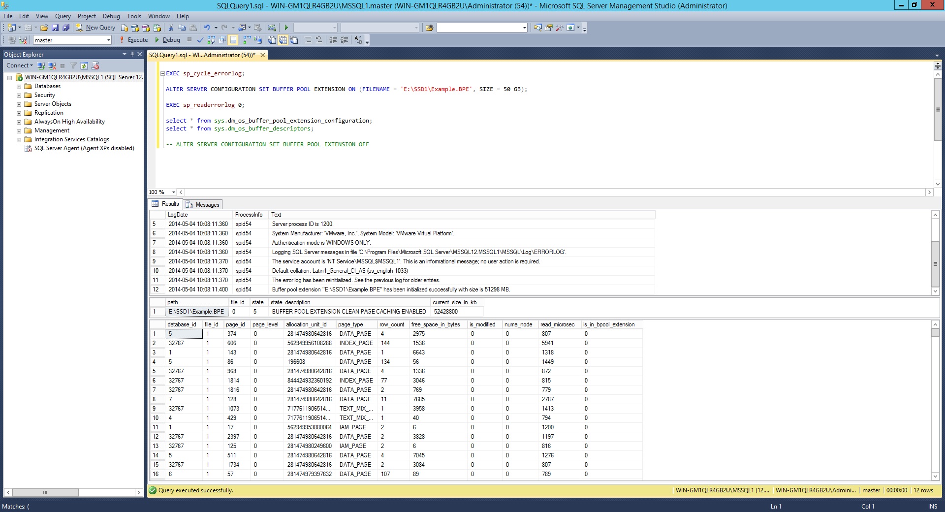 2014-05-04 12:39:01.12 spid8s Starting up database 'master'. 2014-05-04 12:39:01.18 Server CLR version v4.0.30319 loaded. 2014-05-04 12:39:01.24 spid8s Buffer pool extension "E:\SSD1\Example.BPE" has been initialized successfully with size is 51200 MB. 2014-05-04 12:39:01.24 spid8s Resource governor reconfiguration succeeded. 2014-05-04 12:39:01.24 spid8s SQL Server Audit is starting the audits. This is an informational message. No user action is required. 2014-05-04 12:39:01.24 spid8s SQL Server Audit has started the audits. This is an informational message. No user action is required. 2014-05-04 12:39:01.28 spid8s SQL Trace ID 1 was started by login "sa".