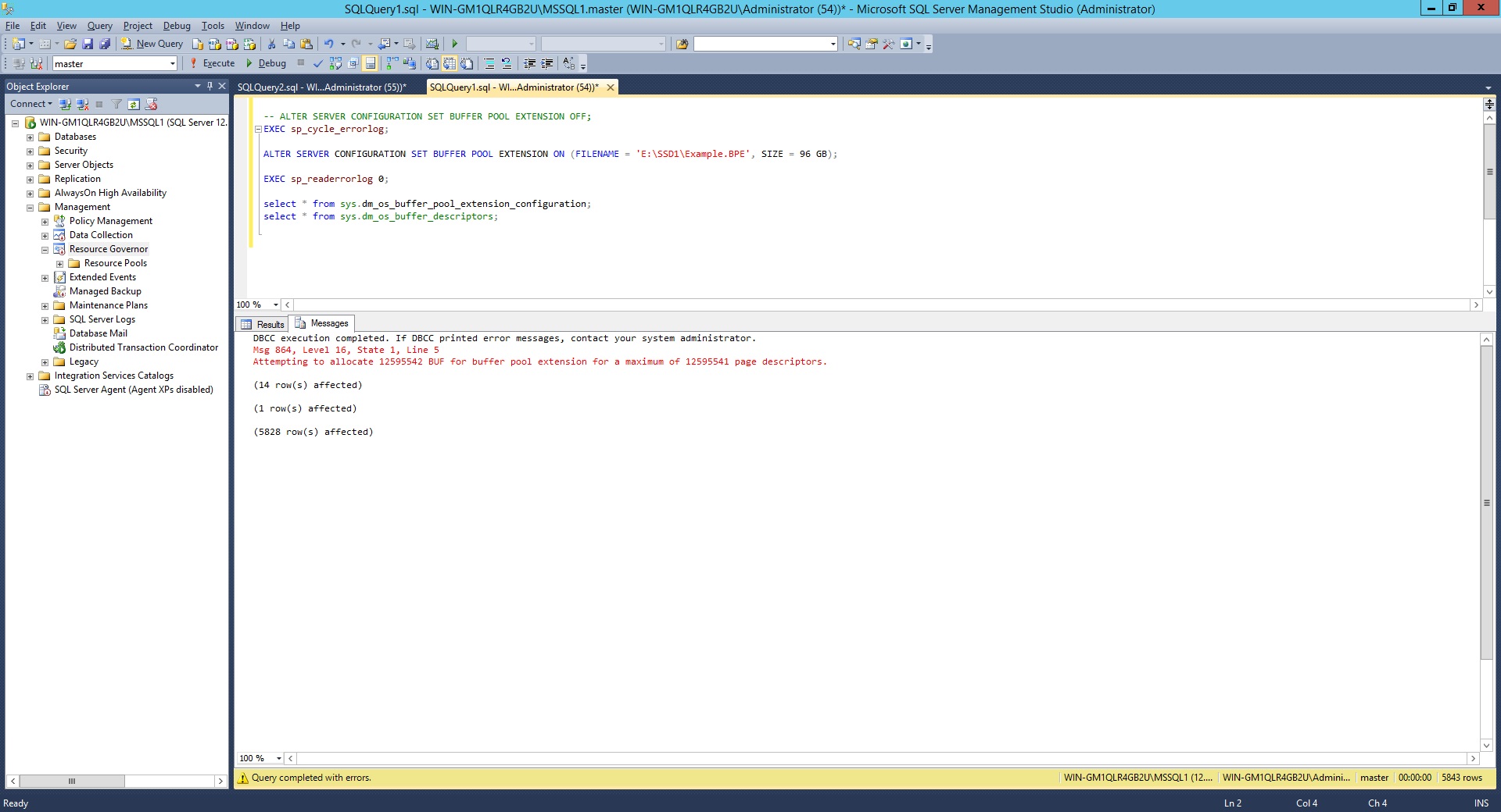 We make a folder and add a 50GB bufferpool extension on the E: drive, from the sql server errorlog we see this took no time at all to allocate.
