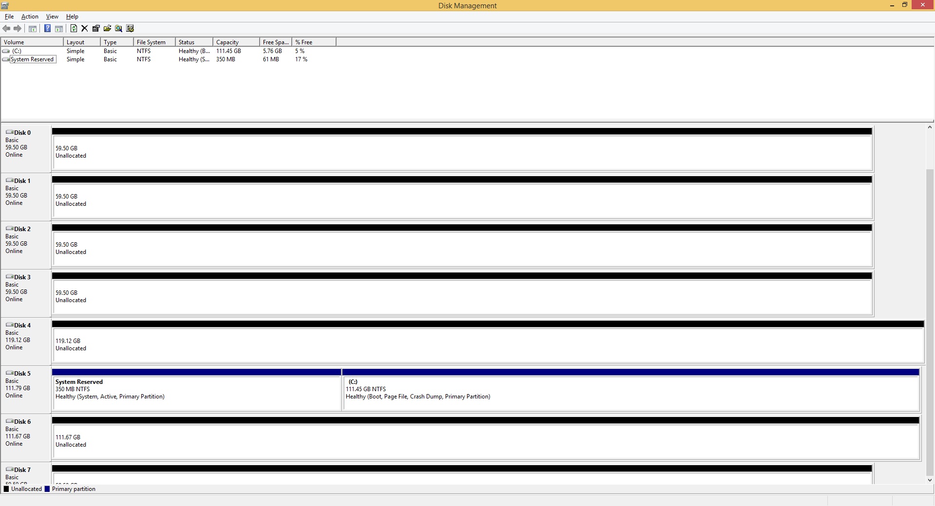 We have added 8 SSDs to the host, all drives are unallocated apart from disk 5 the boot drive