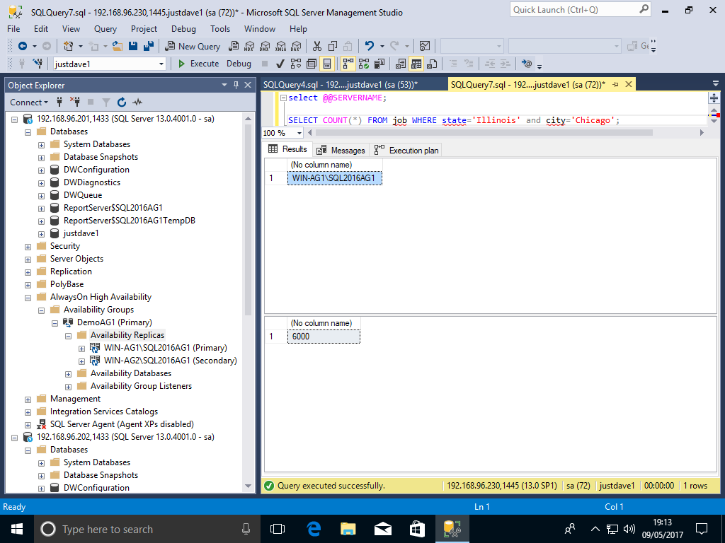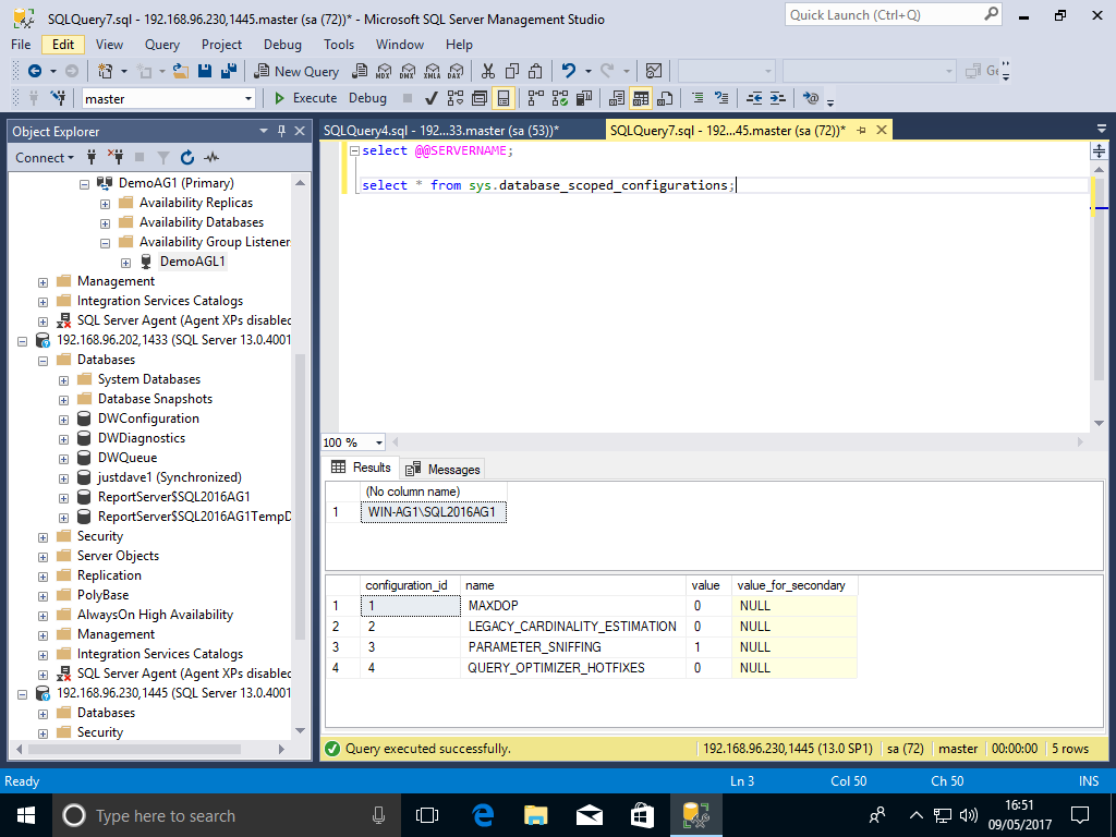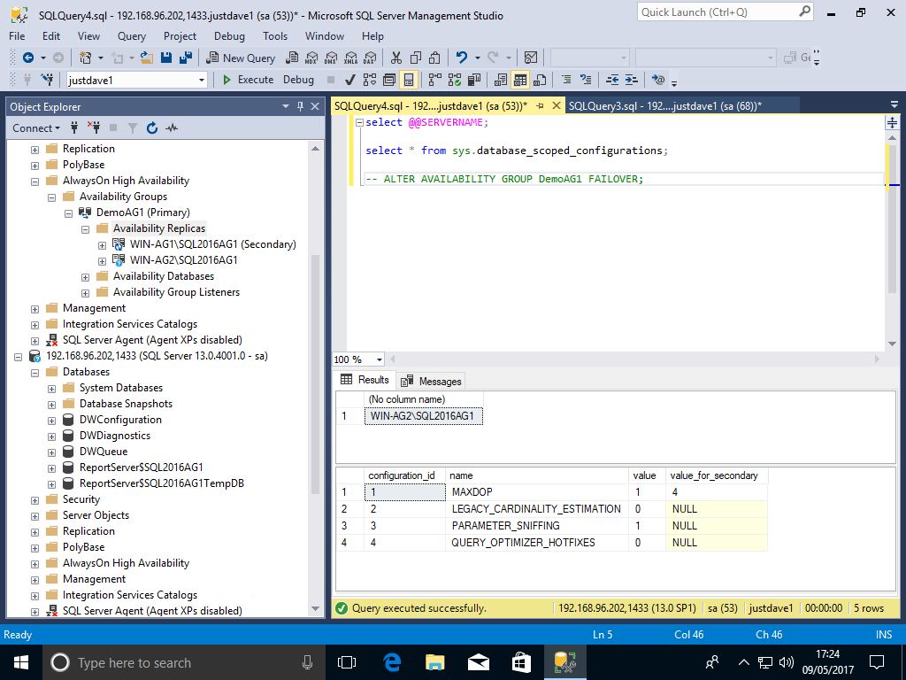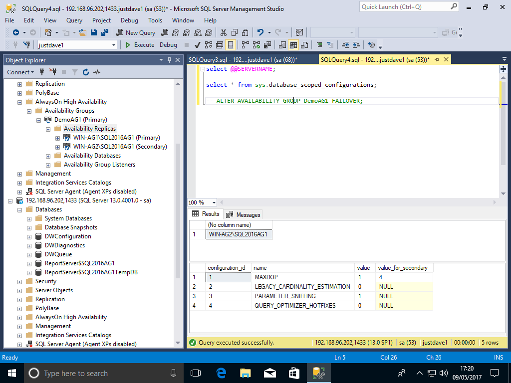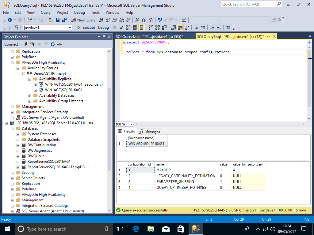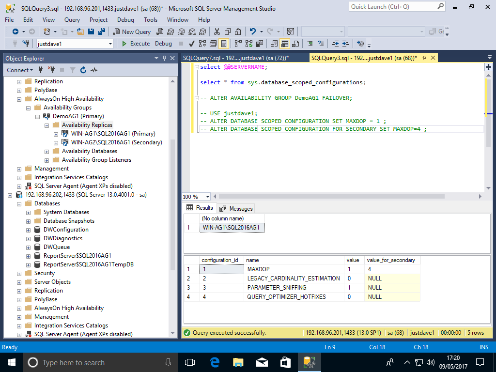 USE justdave1; ALTER DATABASE SCOPED CONFIGURATION SET MAXDOP = 1 ; ALTER DATABASE SCOPED CONFIGURATION FOR SECONDARY SET MAXDOP=4 ;We check when directly connected to 192.168.96.200 machine WIN-AG1 (primary)