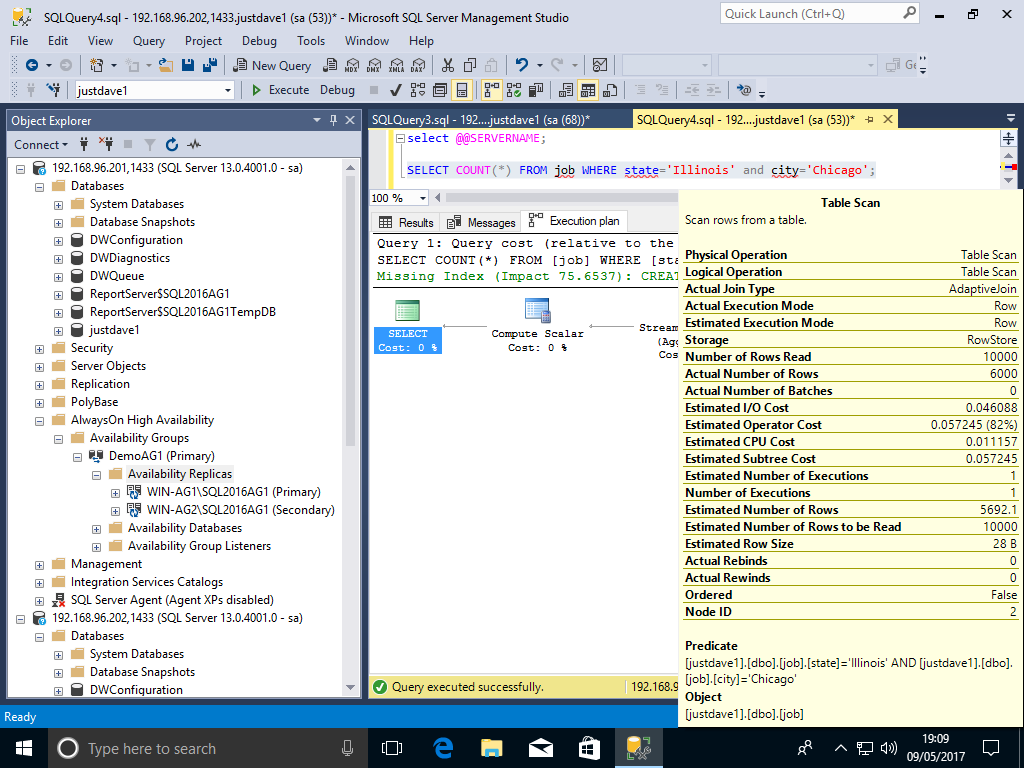 We then run a query on the primary WIN-AG2 which will use the NEW cardiniality estimator.