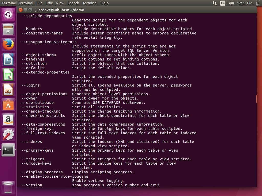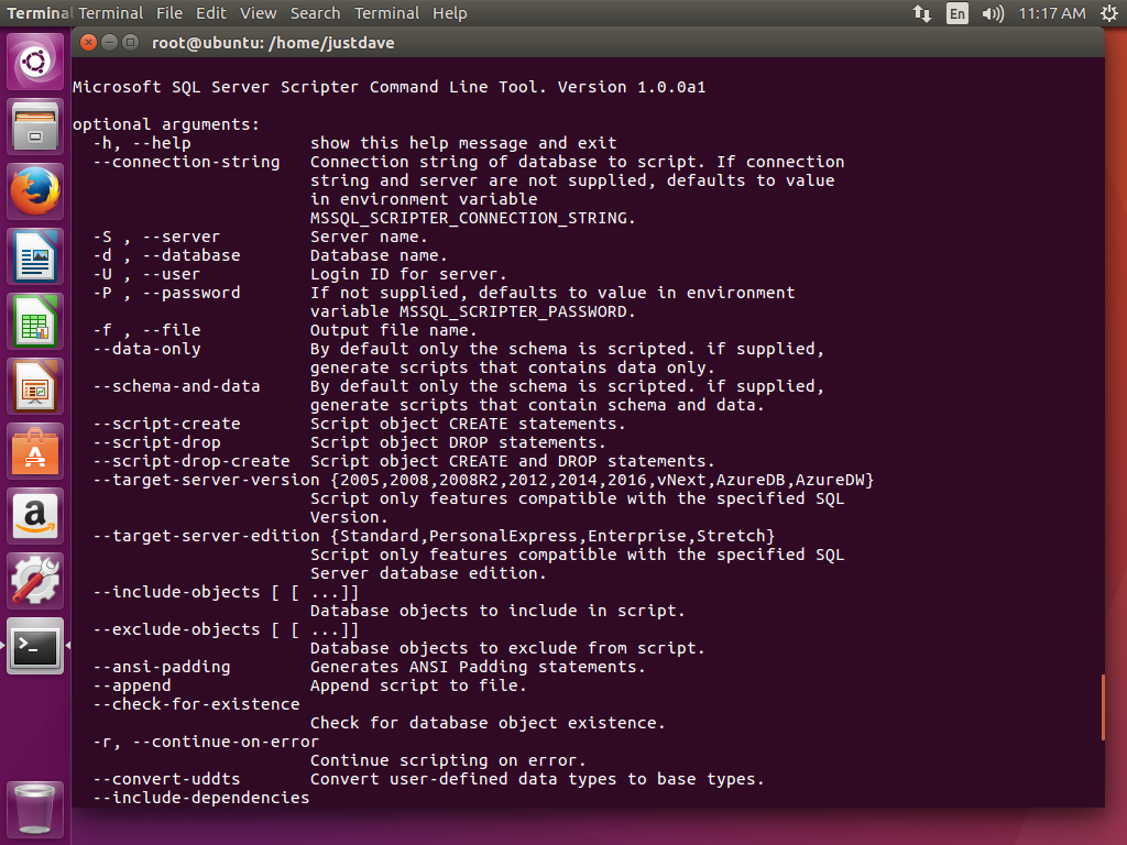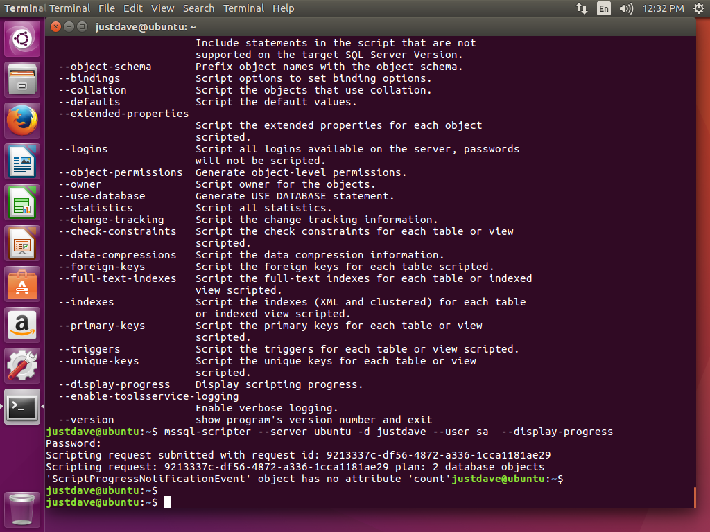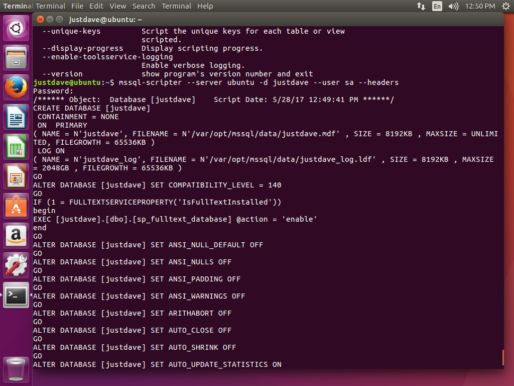 mssql-scripter --server ubuntu -d justdave --user sa --schema-and-data