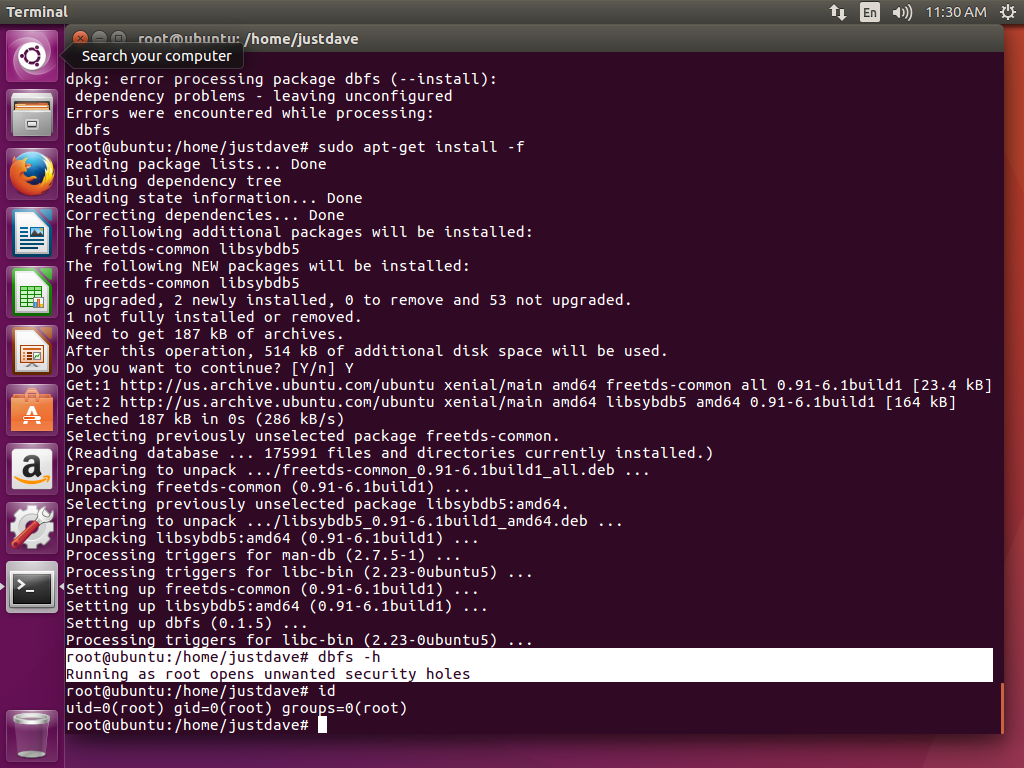 NOTE: The dbfs tool will not run as root as this would "open unwanted security holes"!